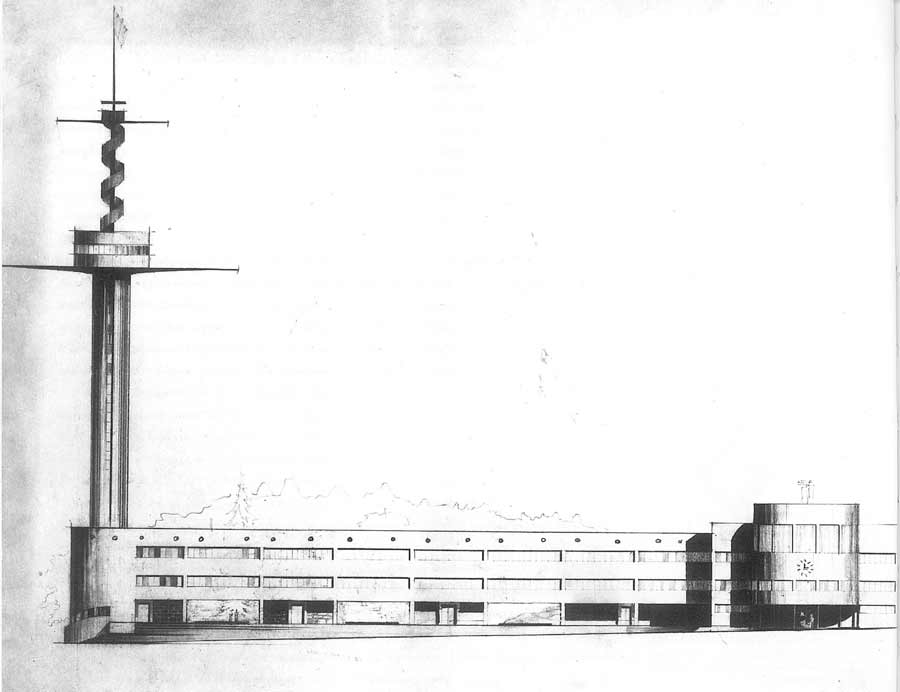 Arkkitehti Erkki Huttusen kaupungintalon suunnittelukilpailuehdotus. Lisäsiivestä luovuttiin säästösyistä rakennusvaiheessa. Komeat olisivat olleet nuo suunnitelman torille laskeutuvat portaat! Huttusen töitä löytyy kaupungistamme muitakin mm. Liittotalo Ruotsinsalmenkadun ja Keskuskadun kulmassa.